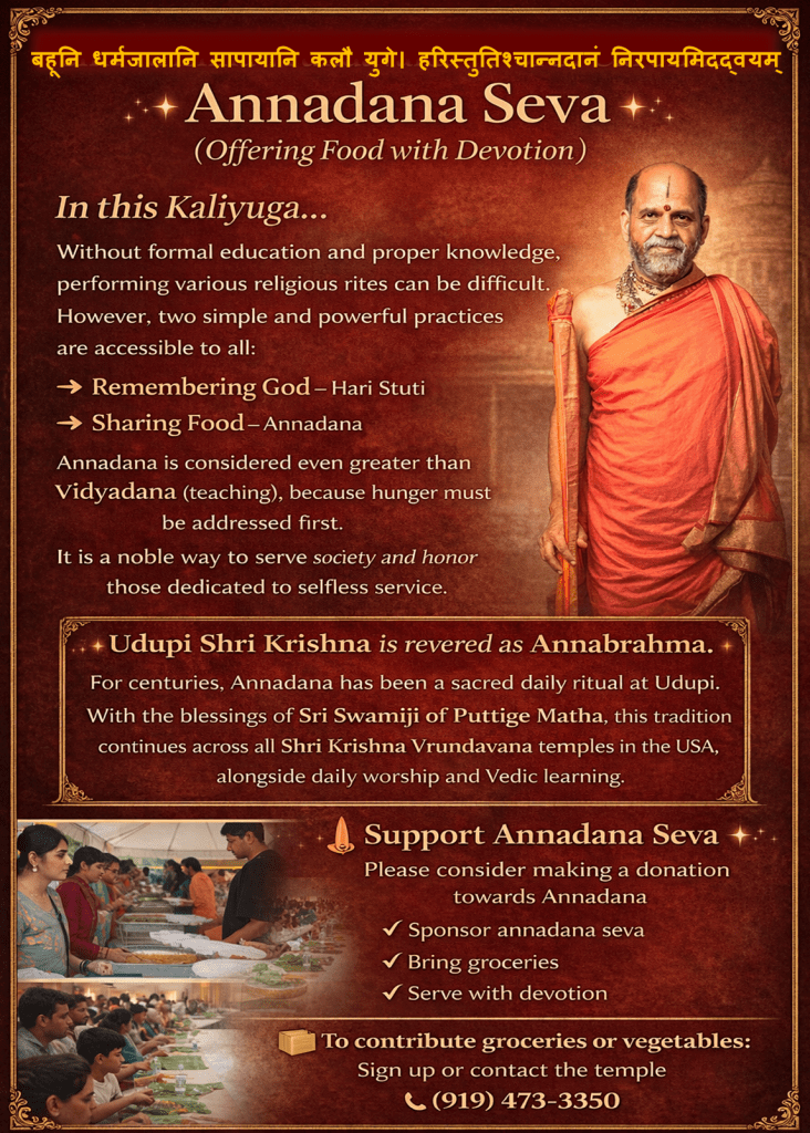 Udupi Shri Krishna is praised as Annabrahma. Annadana is one of the daily rituals performed at Udupi temple for centuries. Continuing that great tradition, Sri Swamiji of Puttige Matha has mandated annadana at all Shri Krishna Vrundavana temples in USA to be carried out in addition to their daily rituals of worships, and Vedic knowledge sharing.