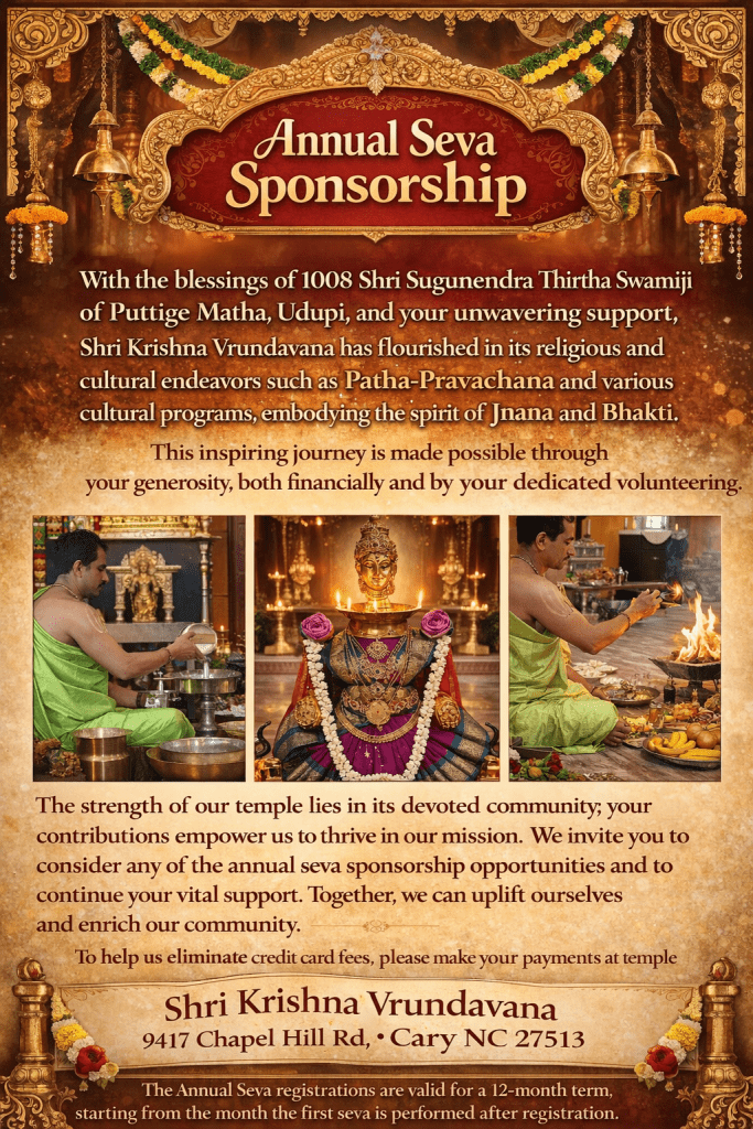 Please enable JavaScript in your browser to complete this form.Please enable JavaScript in your browser to complete this form.Annual Seva1.Satyanarayana Pooja - Poornima - $601.002.Ganahoma - Sankashti - $601.003a.Durga Namaskara - Amavasya - $601.003b.Durga Namarchana-Amavasya - $251.004.Madhu Abhishekha - One Tuesday per month - $375.005.Rudrabhishekha - one Monday per month - $501.006.Panchamrita - one Thursday per month - $601.007.Nitya Pooja Seva - one day per month - $1,001.008.Alankara seva - one day per month - $1,001.00A.Annadana - one day per month - $1,001.00PLEASE NOTE: #4,5,6 sevas will be performed during the first week of the CALENDAR month. If the day falls on Ekadashi or if a conflict exits, then that seva will be performed during the 2nd week.Day of the Month *Please indicate day of the month to perform sevas such as Nitya Pooja, Alankara, AnnadanaMonthly recurrence *One Mon/Tues/Thursday per month services generally will be performed during the first week of the monthWhen Ekadashi or certain observations prevent us from performing this monthly seva during the first week of the month, we may choose to perform the service during the 2nd week of the month.Credit card feesWe thank you for covering the credit card fees along with your donation. Total *$0.00Name *Phone *Email *Gotra (optional)List Nakshatra(optional) and Names of all family members *RenewList in the same order (nakshatra and name) YOU CAN WRITE "RENEW" to take this information from the last year's registration. Comments Payment Option: *CheckCredit CardYour donation is tax deductible. Checks:Payable to "SRCF". Checks can be dropped off at the temple office or can be mailed to the temple address.Credit Card FeesWe thank you in advance for considering additional 3% to cover the cost of credit card fees.Square *CardName on CardSpam verification * = Please excuse us for verifying this is not a spam submission. ThanksSubmit