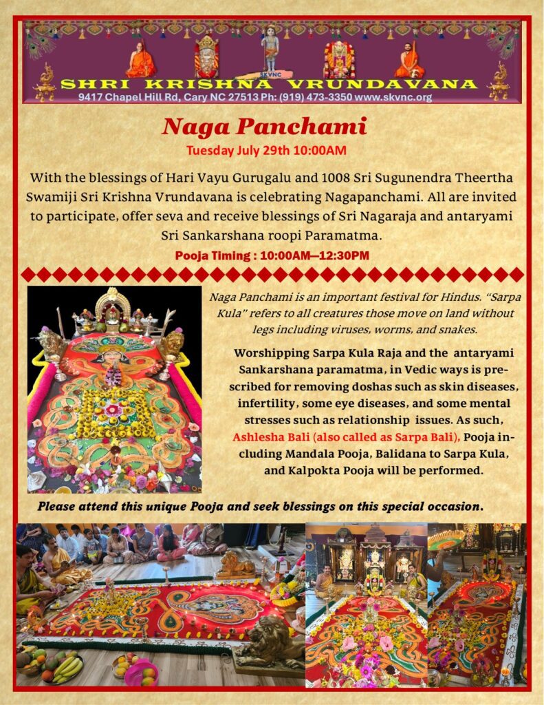 The Priest has to draw an attractive ‘Mandala’ of ‘Naaga’ including 72 squares and a ‘Padma’ and the exact signs of Naagas with colorful Rangoli Powder in a traditional manner. Along with Sankarshana Pooja, priest has to invoke the 8 Naaga Kulaadhipati’s and 72 Parivaara Naagas by chanting each name of Naaga Devata as described by Sri Vedavyasa in Mahaa Bhaarata.